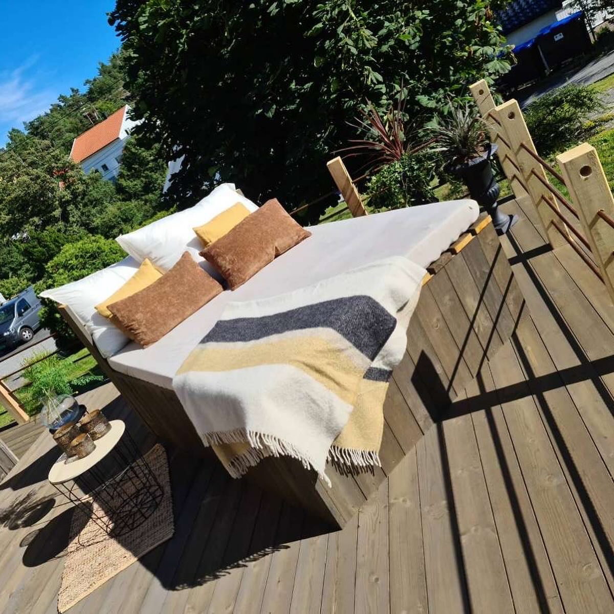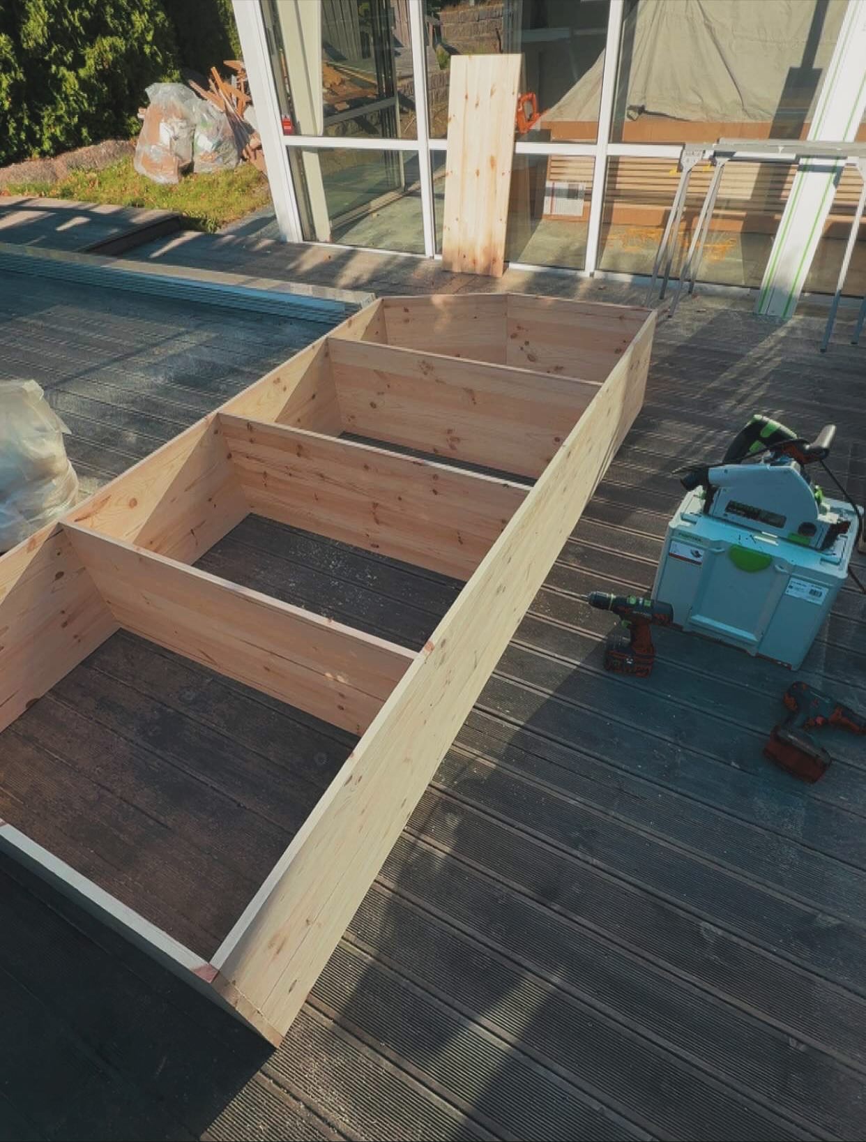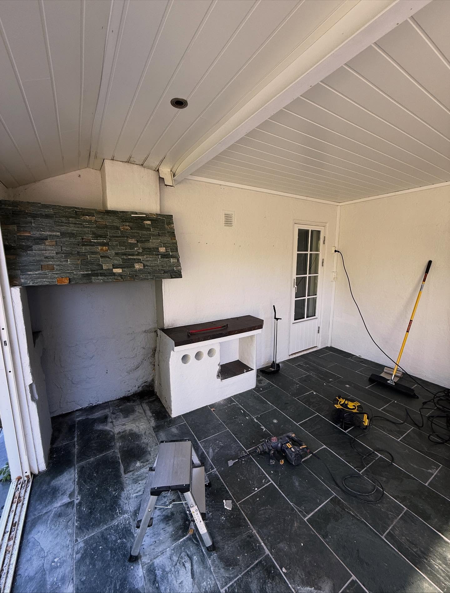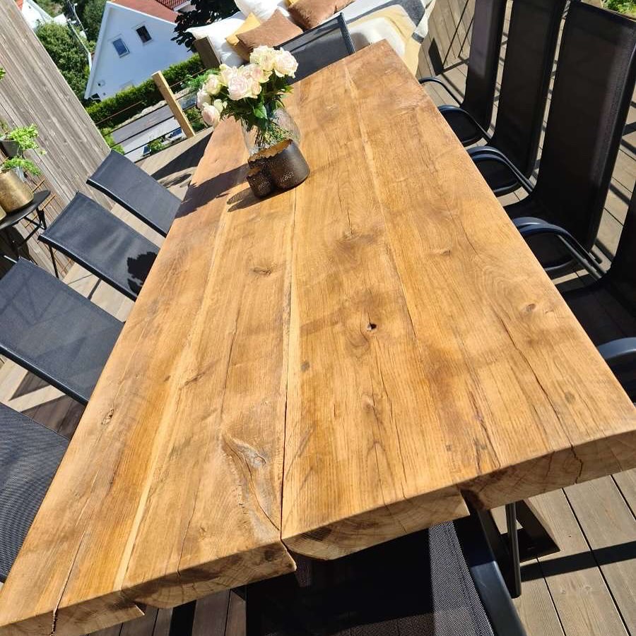 Vi har ferdigstilt et omfattende prosjekt der hele uteområdet har fått et løft. Vi har skiftet bordkledning og lagt nye terrassebord, som gir huset et moderne og velholdt uttrykk. I tillegg har vi snekret spesialtilpassede utemøbler: et solid spisebord for hyggelige måltider og en dobbel solseng for maksimal avslapning i sola.